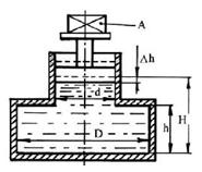Определить объемный модуль упругости жидкости, если под действием груза A массой m=250 кг поршень прошел расстояние Δh=5 мм. Начальная высота положения поршня (без груза) H=1,5 м, диаметры поршня d=80 мм и резервуара D=300 мм, высота резервуара h=1,3 м. Весом поршня пренебречь. Резервуар считать абсолютно жестким. ![]()