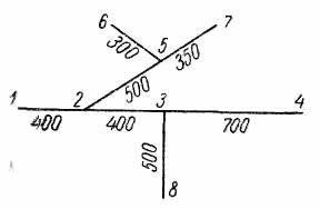 Определить диаметры труб для участков тупиковой водопроводной сети и установить требуемую высоту водонапорной башни в точке 1 для подачи следующих расходов в конечные пункты сети: Q4=0,03 м3/с, Q6=0,006 м3/с, Q7=0,01 м3/с и Q8=0,018 м3/с. Длины участ