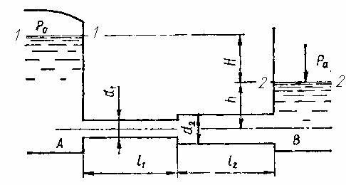 Для студентов ТОГУ по предмету ГидромеханикаРезервуары А и Б соединены горизонтальной новой чугунной трубой переменного сечения с длинами участков l1=10 м, l2=6 м и диаметрами d1 = 50 мм и d2 = Резервуары А и Б соединены горизонтальной новой чугунной трубой переменного сечения с длинами участков l1=10 м, l2=6 м и диаметрами d1 = 50 мм и d2 =