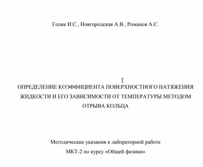 Для студентов МГТУ им. Н.Э.Баумана по предмету ФизикаОпределение коэффициента поверхностного натяжения жидкости и его зависимости от температуры методом отрыва кольцаОпределение коэффициента поверхностного натяжения жидкости и его зависимости от температуры методом отрыва кольца