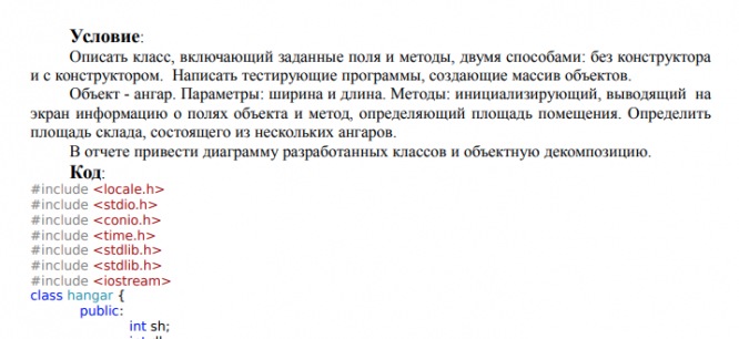 Условие: Описать класс, включающий заданные поля и методы, двумя способами: без конструктора и с конструктором. Написать тестирующие программы, создающие массив объектов. Объект - ангар. Параметры: ширина и длина. Методы: инициализирующий, выводящий на экран информацию о полях объекта и метод, определяющий площадь помещения. Определить площадь склада, состоящего из нескольких ангаров. В отчете привести диаграмму разработанных классов и объектную декомпозицию. ![]()