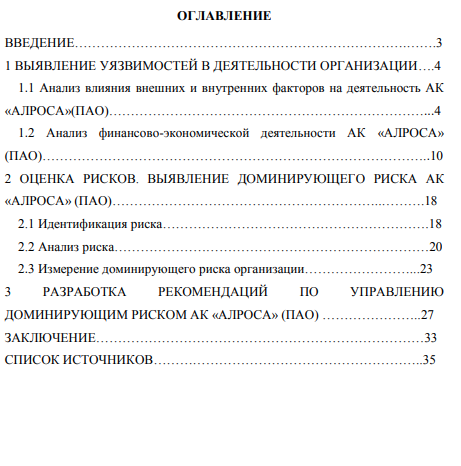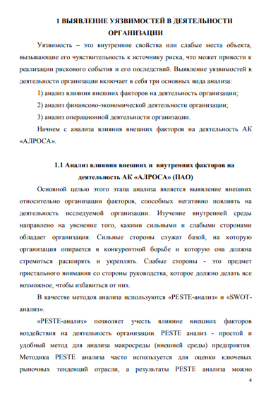 Целью данного исследования является идентификация и анализ рисков АК «АЛРОСА» (ПАО). Для достижения этой цели требуется решить следующие задачи: 1) выбрать организацию для исследования; 2) в результате анализа выявить уязвимости в деятельности организации; 3) провести оценку рисков организации, выявить доминирующий риск; 4) разработать рекомендации по управлению доминирующим риском; Объектом исследования является публичное акционерное общество АК «АЛРОСА» (ПАО) Предметом исследования является система управления рисками в организации АК «АЛРОСА» (ПАО). Информационно-аналитической базой исследования является годовая бухгалтерская отчетность АК «АЛРОСА» (ПАО) за 2016-2018 гг.