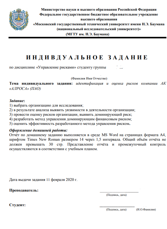 Для студентов МГТУ им. Н.Э.Баумана по предмету Управление рискамиидентификация и оценка рисков компании АК АЛРОСАидентификация и оценка рисков компании АК АЛРОСА