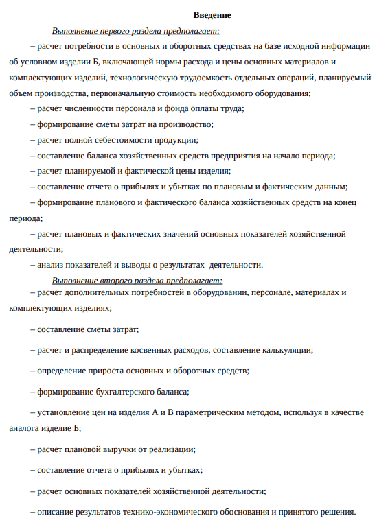 Выполнение первого раздела предполагает: – расчет потребности в основных и оборотных средствах на базе исходной информации об условном изделии Б, включающей нормы расхода и цены основных материалов и комплектующих изделий, технологическую трудоемкость отдельных операций, планируемый объем производства, первоначальную стоимость необходимого оборудования; – расчет численности персонала и фонда оплаты труда; – формирование сметы затрат на производство; – расчет полной себестоимости продукции; – составление баланса хозяйственных средств предприятия на начало периода; – расчет планируемой и фактической цены изделия; – составление отчета о прибылях и убытках по плановым и фактическим данным; – формирование планового и фактического баланса хозяйственных средств на конец периода; – расчет плановых и фактических значений основных показателей хозяйственной деятельности; – анализ показателей и выводы о результатах деятельности. Выполнение второго раздела предполагает: – расчет дополнительных потребностей в оборудовании, персонале, материалах и комплектующих изделиях; – составление сметы затрат; – расчет и распределение косвенных расходов, составление калькуляции; – определение прироста основных и оборотных средств; – формирование бухгалтерского баланса; – установление цен на изделия А и В параметрическим методом, используя в качестве аналога изделие Б; – расчет плановой выручки от реализации; – составление отчета о прибылях и убытках; – расчет основных показателей хозяйственной деятельности; – описание результатов технико-экономического обоснования и принятого решения.