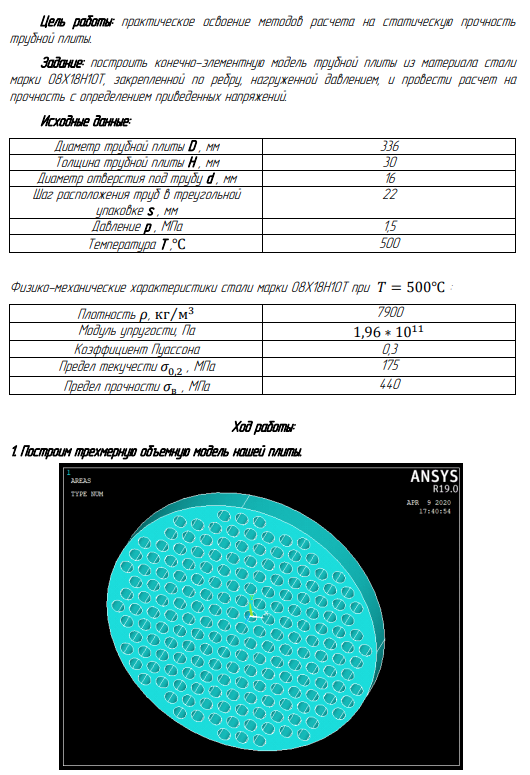 Задание: построить конечно-элементную модель трубной плиты из материала стали марки 08Х18Н10Т, закрепленной по ребру, нагруженной давлением, и провести расчет на прочность с определением приведенных напряжений