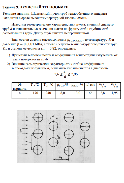 ЛУЧИСТЫЙ ТЕПЛООБМЕН Условие задания. Шахматный пучок труб теплообменного аппарата находится в среде высокотемпературной газовой смеси. Известны геометрические характеристики пучка: внешний диаметр труб d и относительные значения шагов по фронту s1/d и глубине s2/d расположения труб. Длину труб считать неограниченной. Зная состав смеси в массовых долях