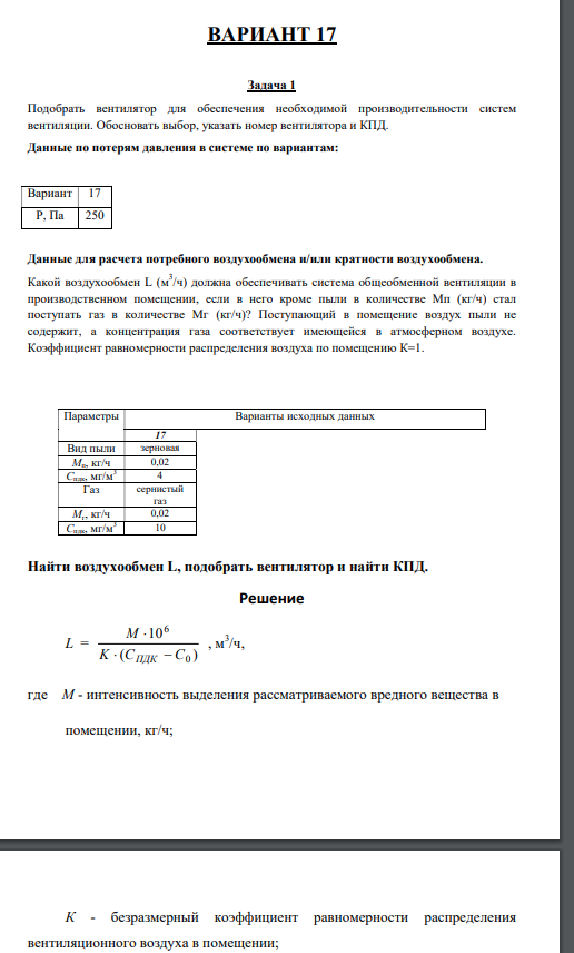 Задача 1 Подобрать вентилятор для обеспечения необходимой производительности систем вентиляции. Обосновать выбор, указать номер вентилятора и КПД. Данные по потерям давления в системе по вариантам: