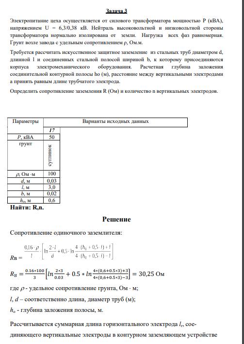 Электропитание цеха осуществляется от силового трансформатора мощностью Р (кВА), напряжением U = 6,3/0,38 кВ. Нейтраль высоковольтной и низковольтной стороны трансформатора нормально изолирована от земли. Нагрузка всех фаз равномерная. Грунт возле завода с удельным сопротивлением ρ, Ом.м. Требуется рассчитать искусственное защитное заземление из стальных труб диаметром d, длинной l и соединенных стальной полосой шириной b, к которому присоединяются корпуса электромеханического оборудования. Расчетная глубина заложения соединительной контурной полосы hо (м), расстояние между вертикальными электродами а принять равным длине трубчатого электрода. Определить сопротивление заземления R (Ом) и количество n вертикальных электродов