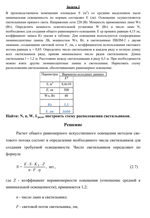 В производственном помещении площадью S (м2 ) со средним выделением пыли минимальная освещенность по нормам составляет Е (лк). Освещение осуществляется светильникам прямого света. Напряжение сети 220 (В). Мощность применяемых ламп Wл (Вт). Определить мощность осветительной установки W (Вт) и число ламп N, необходимое для создания общего равномерного освещения. Е ср принять равным 4,15 лк, коэффициент запаса Кз указан в таблице. Для освещения используются газоразрядные люминесцентные лампы ЛБ, мощностью Wл, Вт, в светильниках ПВЛМ-2 с двумя лампами, создающими световой поток F, лм, с коэффициентом использования светового потока равным η = 0,85. Определить число светильников в каждом ряду и полную длину всех светильников ряда, приняв минимальное число рядов светильников. Длина светильника l = 1,2 м. Расстояние между светильниками в ряду 0,3 м. При необходимости можно взять другие люминесцентные лампы в светильники. Нарисовать схему расположения светильников, обеспечивающих равномерное освещение.