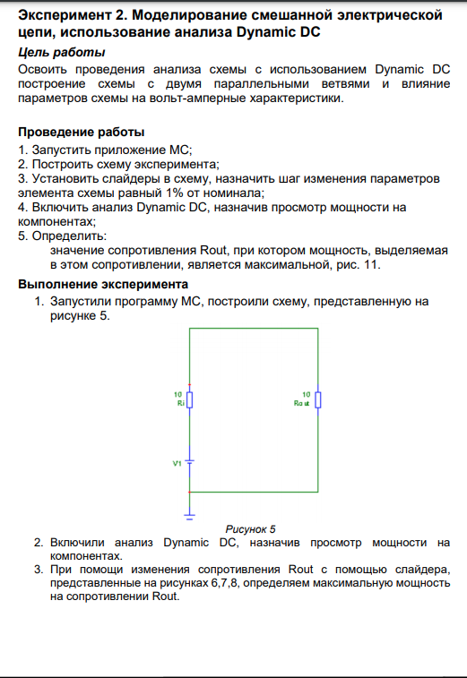 Эксперимент 2. Моделирование смешанной электрической цепи, использование анализа Dynamic DC