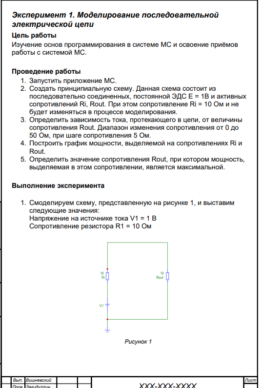 Эксперимент 1. Моделирование последовательной электрической цепи