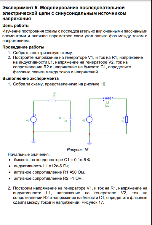 Эксперимент 5. Моделирование последовательной электрической цепи с синусоидальным источником напряжения Цель работы Изучение построения схемы с последовательно включенными пассивными элементами и влияние параметров схем угол сдвига фаз между током и напряжением.