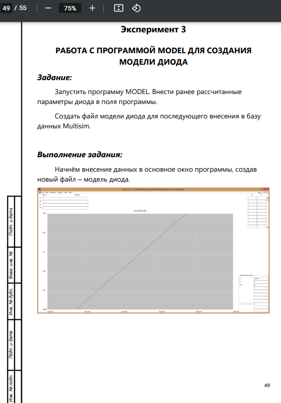 РАБОТА С ПРОГРАММОЙ MODEL ДЛЯ СОЗДАНИЯ МОДЕЛИ ДИОДА Задание: Запустить программу MODEL. Внести ранее рассчитанные параметры диода в поля программы. Создать файл модели диода для последующего внесения в базу данных Multisim.