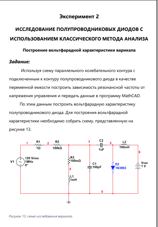 Задание: Используя схему параллельного колебательного контура с подключенным к контуру полупроводникового диода в качестве переменной емкости построить зависимость резонансной частоты от напряжения управления и передать данные в программу MathCAD. По этим данным построить вольтфарадную характеристику полупроводникового диода. Для построения вольтфарадной характеристики необходимо собрать схему, представленную на рисунке 13.