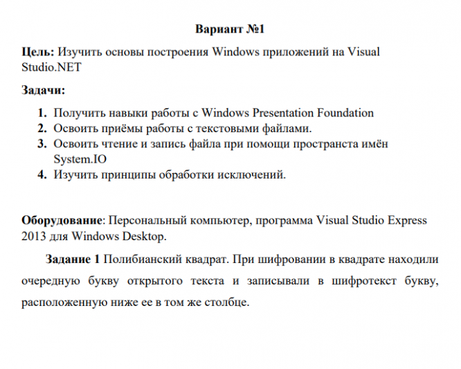 Цель: Изучить основы построения Windows приложений на Visual Studio.NET Задачи: 1. Получить навыки работы с Windows Presentation Foundation 2. Освоить приёмы работы с текстовыми файлами. 3. Освоить чтение и запись файла при помощи пространста имён System.IO 4. Изучить принципы обработки исключений. Оборудование: Персональный компьютер, программа Visual Studio Express 2013 для Windows Desktop. Задание 1 Полибианский квадрат. При шифровании в квадрате находили очередную букву открытого текста и записывали в шифротекст букву, расположенную ниже ее в том же столбц