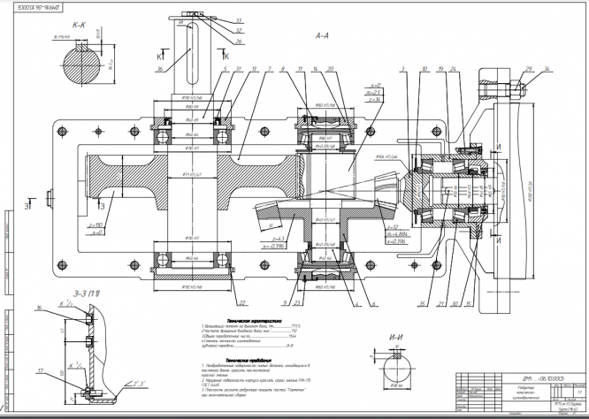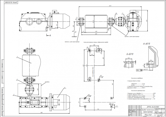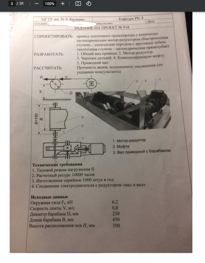 Для студентов МГТУ им. Н.Э.Баумана по предмету Детали машин (ДМ)ДМ 916 - Привод ленточного транспортера с коническо-цилиндрическим мотор-редуктором (быстроходная ступень-коническая передача с круговым зубом, тихохоДМ 916 - Привод ленточного транспортера с коническо-цилиндрическим мотор-редуктором (быстроходная ступень-коническая передача с круговым зубом, тихохо
