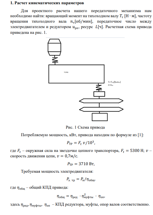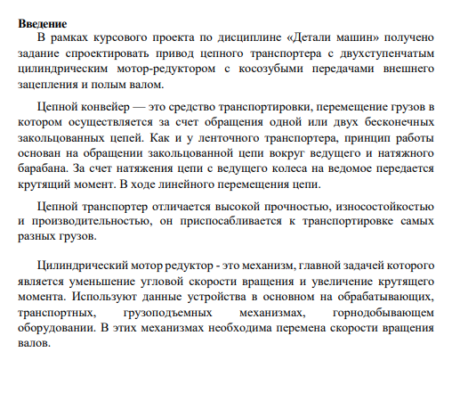 ВведениеВ рамках курсового проекта по дисциплине «Детали машин » получено задание спроектировать привод цепного транспортера с двухступенчатым цилиндрическим мотор-редуктором с косозубыми передачами внешнего зацепления и полым валом. Цепной конвейер — это средство транспортировки, перемещение грузов в котором осуществляется за счет обращения одной или двух бесконечных закольцованных цепей. Как и у ленточного транспортера, принцип работы основан на обращении закольцованной цепи вокруг ведущего и натяжного барабана. За счет натяжения цепи с ведущего колеса на ведомое передается крутящий момент. В ходе линейного перемещения цепи. Цепной транспортер отличается высокой прочностью, износостойкостью и производительностью, он приспосабливается к транспортировке самых разных грузов. Цилиндрический мотор редуктор - это механизм, главной задачей которого является уменьшение угловой скорости вращения и увеличение крутящего момента. Используют данные устройства в основном на обрабатывающих, транспортных, грузоподъемных механизмах, горнодобывающем оборудовании. В этих механизмах необходима перемена скорости вращения валов.