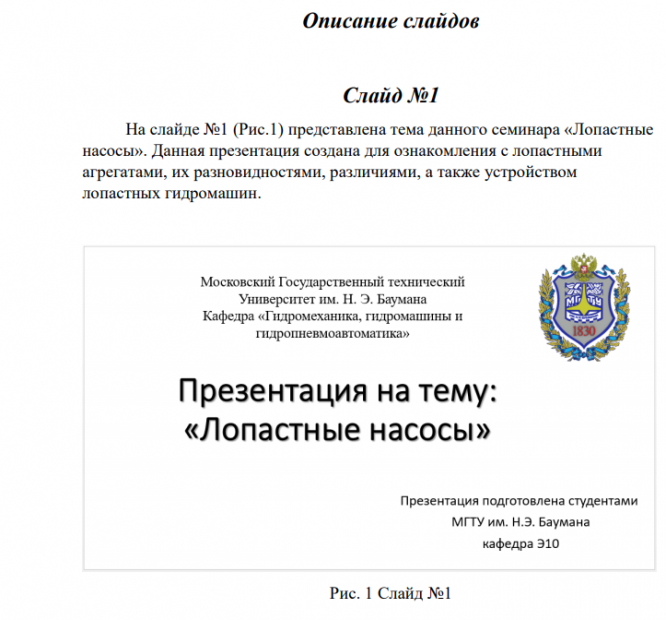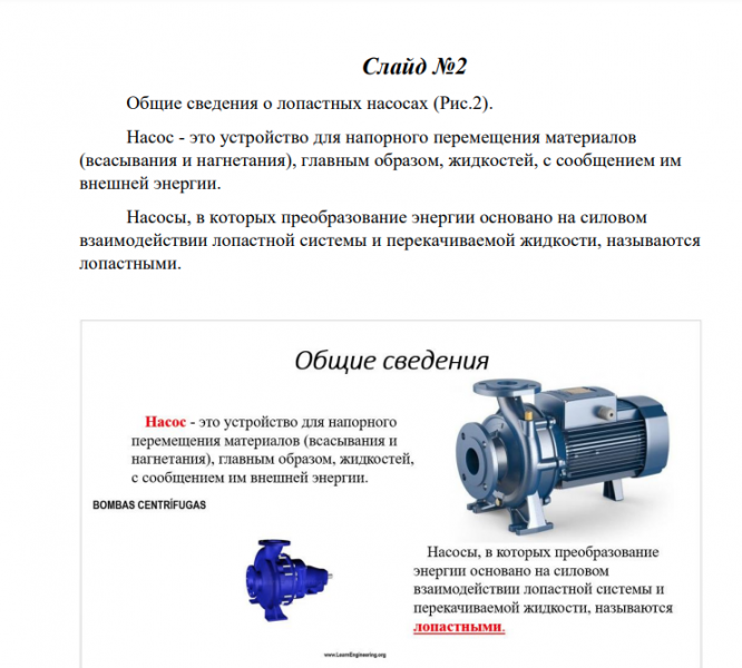 Необходимо самостоятельно подготовить обзорную презентацию по теме «Лопастные гидромашины». Данная презентация должна быть ознакомительной и включать в себя основные понятия и конструкции лопастных насосов, которые могут понадобиться для дальнейшего обучения. После просмотра презентации у студентов должно появиться представление о лопастных гидроагрегатах, их различиях, а также о составляющих частях лопастных насосов. При подготовке презентации, нужно учитывать тот факт, что обучающиеся ранее не были знакомы с данными агрегатами.