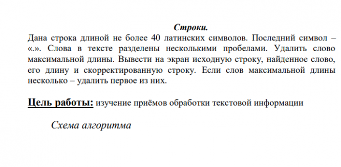 Строки. Дана строка длиной не более 40 латинских символов. Последний символ – «.». Слова в тексте разделены несколькими пробелами. Удалить слово максимальной длины. Вывести на экран исходную строку, найденное слово, его длину и скорректированную строку. Если слов максимальной длины несколько – удалить первое из них. Цель работы: изучение приёмов обработки текстовой информации