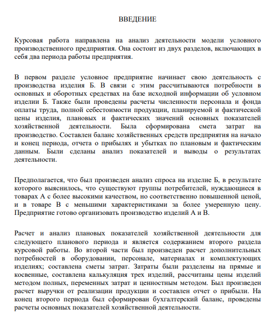 Курсовая работа содержит информацию о работе модели условного производственного предприятии. Данная работа включает планирование производственных ресурсов, расчет и анализ затрат, формирование цены изделия. Расчёт прибыли позволяет охарактеризовать экономический эффект деятельности предприятия. На основании проведенных расчетов формируется отчетность предприятия. Финансово-экономический анализ деятельности предприятия отражает имущественную оценку положения предприятия, оценку эффективности его деятельности, оценку финансовой устойчивости и платёжеспособности предприятия.