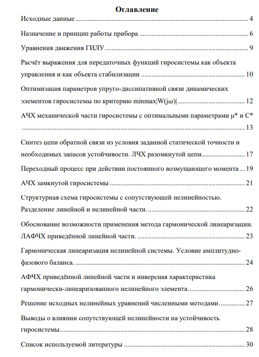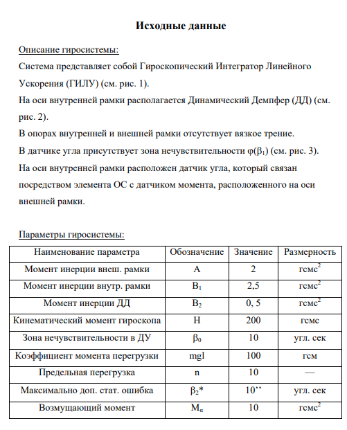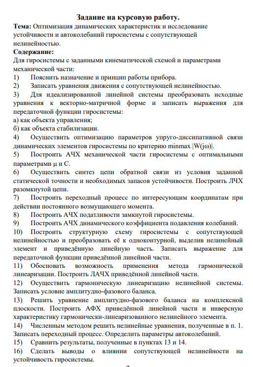 Тема: Оптимизация динамических характеристик и исследование устойчивости и автоколебаний гиросистемы с сопутствующей нелинейностью. Содержание: Для гиросистемы с заданными кинематической схемой и параметрами механической части: 1) Пояснить назначение и принцип работы прибора. 2) Записать уравнения движения с сопутствующей нелинейностью. 3) Для идеализированной линейной системы преобразовать исходные уравнения к векторно-матричной форме и записать выражения для передаточной функции гиросистемы: а) как объекта управления; б) как объекта стабилизации. 4) Осуществить оптимизацию параметров упруго-диссипативной связи динамических элементов гиросистемы по критерию minmax |W(jω)|. 5) Построить АЧХ механической части гиросистемы с оптимальными параметрами µ и С. 6) Осуществить синтез цепи обратной связи из условия заданной статической точности и необходимых запасов устойчивости. Построить ЛЧХ разомкнутой цепи. 7) Построить переходный процесс по интересующим координатам при действии постоянного возмущающего момента. 8) Построить АЧХ податливости замкнутой гиросистемы. 9) Построить АЧХ динамического коэффициента подавления колебаний. 10) Построить структурную схему гиросистемы с сопутствующей нелинейностью и преобразовать её к одноконтурной, выделив нелинейный элемент и приведённую линейную часть. Записать выражение для передаточной функции приведённой линейной части. 11) Обосновать возможность применения метода гармонической линеаризации. Построить ЛАЧХ приведённой линейной части. 12) Осуществить гармоническую линеаризацию нелинейной системы. Записать условие амплитудно-фазового баланса. 13) Решить уравнение амплитудно-фазового баланса на комплексной плоскости. Построить АФХ приведённой линейной части и инверсную характеристику гармонически-линеаризованного нелинейного элемента. 14) Численным методом решить нелинейные уравнения, полученные в п. 1. Записать переходный процесс. Определить параметры автоколебаний. 15) Сравнить результаты, полученные в пунктах 13 и 14. 16) Сделать выводы о влиянии сопутствующей нелинейности на устойчивость гиросистемы. 2