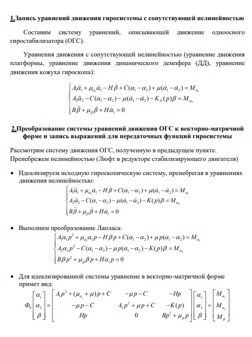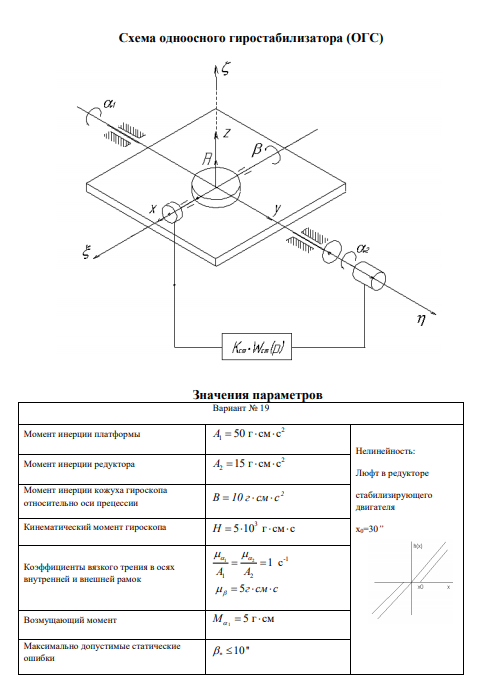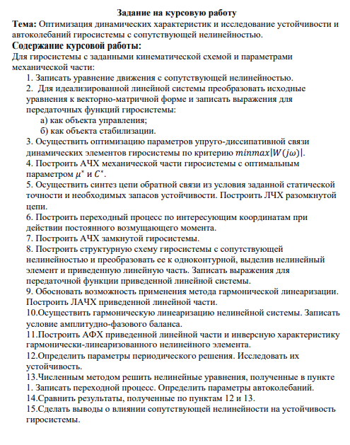 Тема: Оптимизация динамических характеристик и исследование устойчивости и автоколебаний гиросистемы с сопутствующей нелинейностью. Содержание курсовой работы: Для гиросистемы с заданными кинематической схемой и параметрами механической части: 1. Записать уравнение движения с сопутствующей нелинейностью. 2. Для идеализированной линейной системы преобразовать исходные уравнения к векторно-матричной форме и записать выражения для передаточных функций гиросистемы: а) как объекта управления; б) как объекта стабилизации. 3. Осуществить оптимизацию параметров упруго-диссипативной связи динамических элементов гиросистемы по критерию