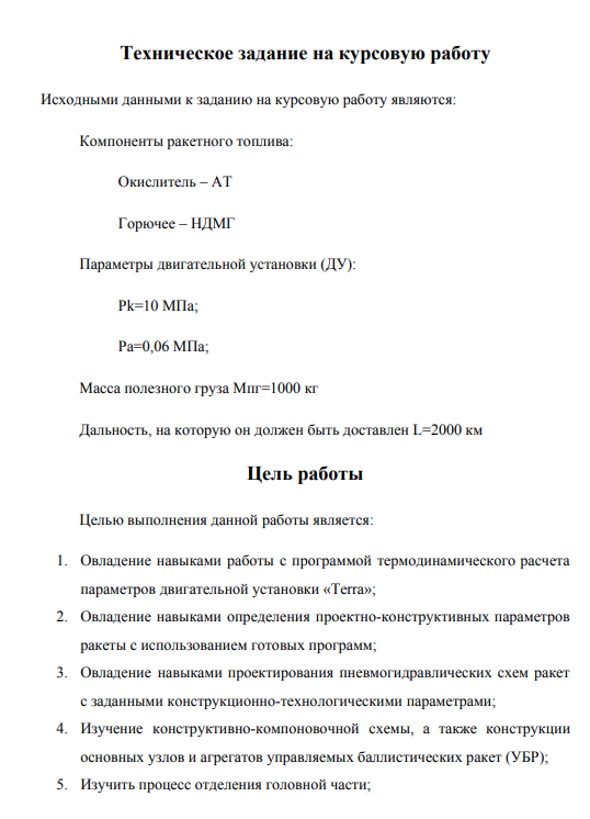 Расчетно-пояснительная записка к курсовому проекту «Проектирование баллистической ракеты» содержит 28 страниц машинописного текста, 2 рисунка, 3 таблицы и 1 приложение. Состоит из 3 частей, для написания было использовано 4 источника. В процессе выполнения работы были выбраны оптимальные проектно-конструктивные параметры из нескольких вариантов, полученных с использованием прикладных программ. Также проведен анализ работы двигательной установки и пневмогидравлической схемы ракеты.
