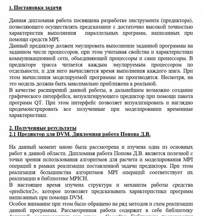 Данная дипломная работа посвящена разработке инструмента (предиктора), позволяющего осуществлять предсказание с достаточно высокой точностью характеристик выполнения параллельных программ, написанных при помощи средств MPI.