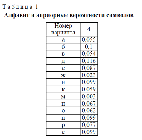 Алфавит источника сообщений с априорными вероятностями символов согласно варианту №4 (табл. 1).