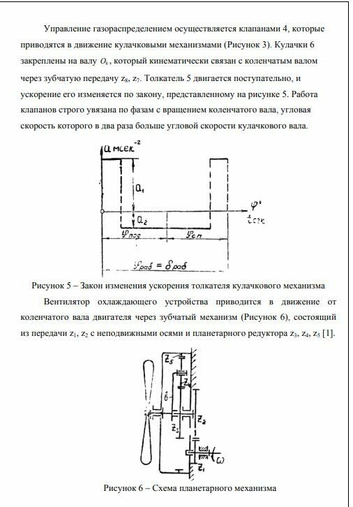 Управление газораспределением осуществляется клапанами 4, которые приводятся в движение кулачковыми механизмами (Рисунок 3). Кулачки 6 закреплены на валу O8 , который кинематически связан с коленчатым валом через зубчатую передачу z8, z7. Толкатель 5 двигается поступательно, и ускорение его изменяется по закону, представленному на рисунке 5. Работа клапанов строго увязана по фазам с вращением коленчатого вала, угловая скорость которого в два раза больше угловой скорости кулачкового вала.