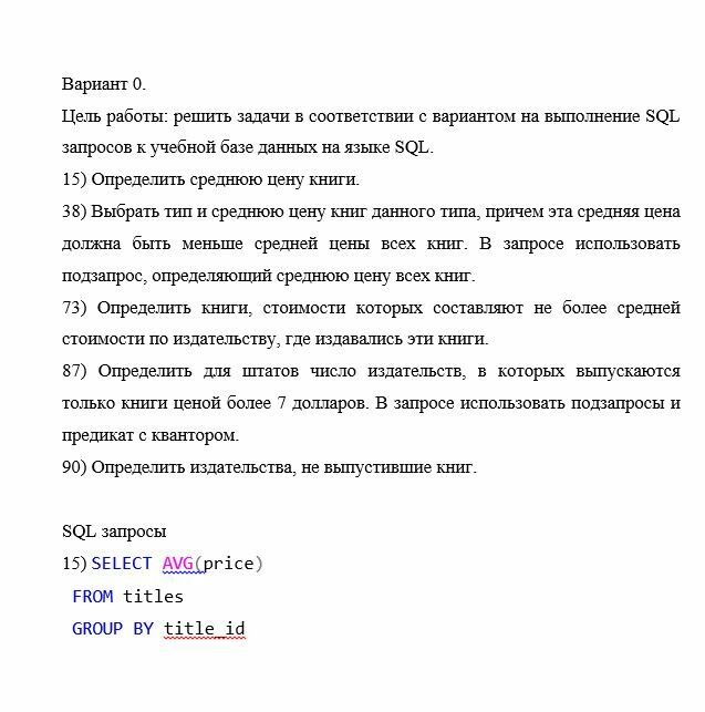 Цель работы: решить задачи в соответствии с вариантом на выполнение SQL запросов к учебной базе данных на языке SQL.