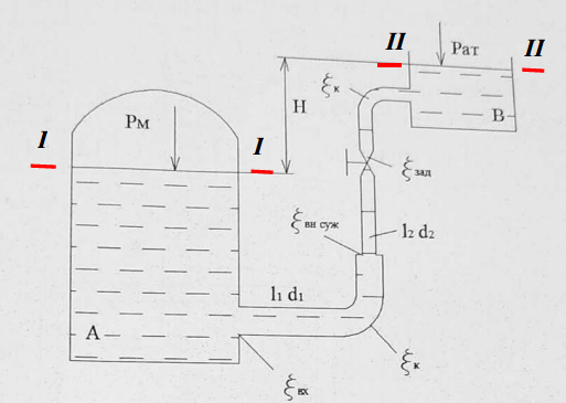 Вода при температуре 10°С из герметичного бака А поступает в открытый резервуар В по короткому трубопроводу (рис.15). Трубопровод состоит из двух участков чугунных, бывших в употреблении труб l1= l2=12м и диаметрами d1=300мм, d2=150мм. Избыточное давление на свободной поверхности резервуара рм=350кПа, высота подачи Н=8м.