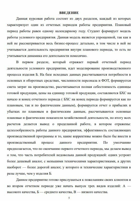 Цель данной курсовой работы — изучить экономические показатели, которые характеризуют экономическую деятельность предприятия и научиться связывать между собой различные факторы, характеризующие предприятие. Для этого составить упрощенную расчетную модель деятельности компании. Работа состоит из двух разделов. В первом разделе рассчитываются показатели для первого отчетного периода, в который предприятие выпускает продукцию только одного вида. Во втором разделе рассчитываются показатели для второго отчетного периода, в который предприятие начинает выпускать уже несколько видов изделий для разных категорий покупателей (в данном разделе, студент сам выбирает программу выпуска продукции на отчетный период, обосновывая перед этим, почему он сделал именно такой выбор). После каждого из разделов, студент должен сделать вывод о проделанной работе, то есть, рассказать о целесообразности данной производственной программы, эффективности компонентов, входящих в нее, изменений, которые стоит сделать на основе полученных результатов