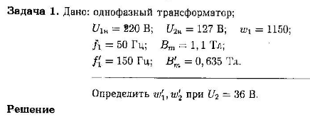 Задача 1. Дано: однофазный трансформатор; U = 220 В; U = 127 B; w1 = 1150; f1 = 50 Гц; Вm = 1,1 Тл; f'1= 150 Гц;В`m = 0,635 Тл.
