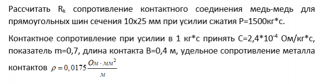 Рассчитать Rk сопротивление контактного соединения медь-медь для прямоугольных шин сечения 10х25 мм при усилии сжатия Р = 1500кг*с. Контактное сопротивление при усилии в 1 кг*с принять С=2,4*10-4 Ом/кг*с, показатель m=0,7, длина контакта B=0,4 м, удельное сопротивление металла контактов 0,0175 Ом*мм2/м