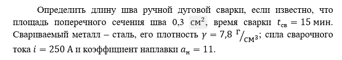 Определить длину шва ручной дуговой сварки, если известно, что площадь поперечного сечения шва 0,3 , время сварки . Свариваемый металл – сталь, его плотность ; сила сварочного тока и коэффициент наплавки .