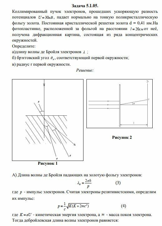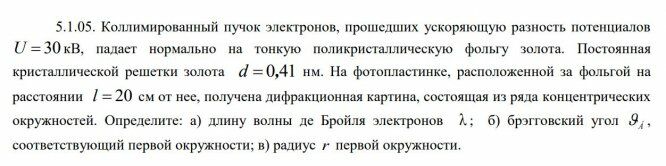 5.1.05. Коллимированный пучок электронов, прошедших ускоряющую разность потенциалов U 30 кВ, падает нормально на тонкую поликристаллическую фольгу золота. Постоянная кристаллической решетки золота d 0,41 нм. На фотопластинке, расположенной за фольгой на расстоянии l 20 см от нее, получена дифракционная картина, состоящая из ряда концентрических окружностей. Определите: а) длину волны де Бройля электронов ; б) брэгговский угол Á , соответствующий первой окружности; в) радиус r первой окружности.
