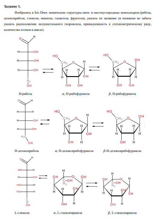 Задание 1. Изобразить в Isis Draw химические структуры пяти- и шестиуглеродных моносахаров (рибоза, дезоксирибоза, глюкоза, манноза, галактоза, фруктоза), указать их название (в названии не забыть указать расположение полуацетального гидроксила, принадлежность к стехиометрическому ряду, количество атомов в цикле).