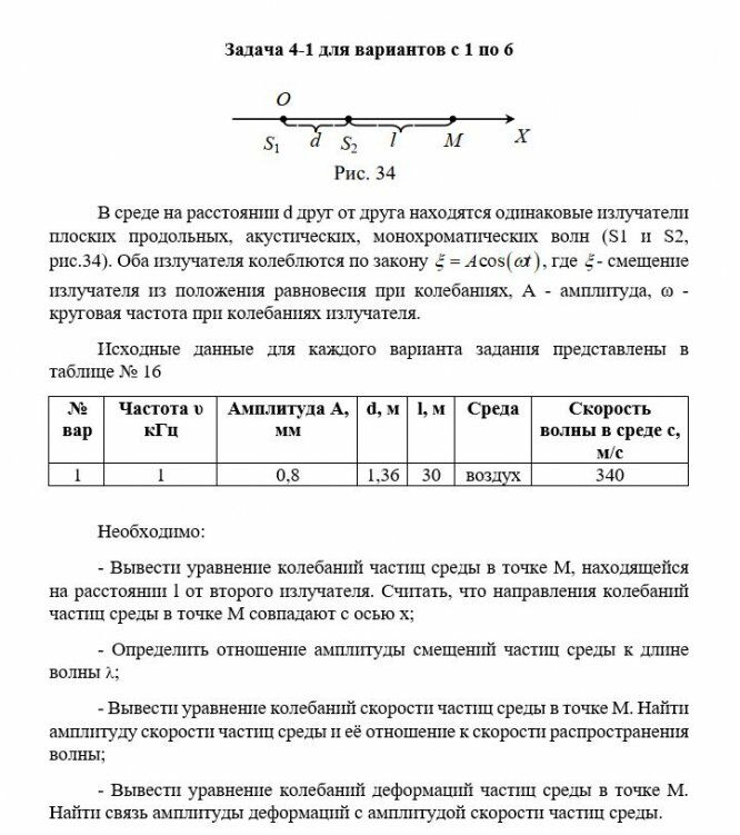 - Вывести уравнение колебаний деформаций частиц среды в точке М. Найти связь амплитуды деформаций с амплитудой скорости частиц среды.