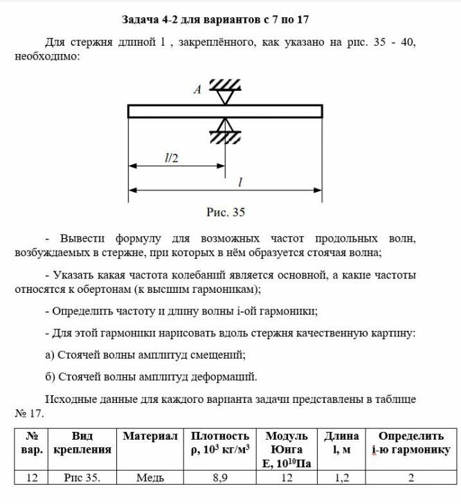 № вар. | Вид крепления | Материал | Плотность ρ, 103 кг/м3 | Модуль Юнга Е, 1010Па | Длина l, м | Определить i-ю гармонику |