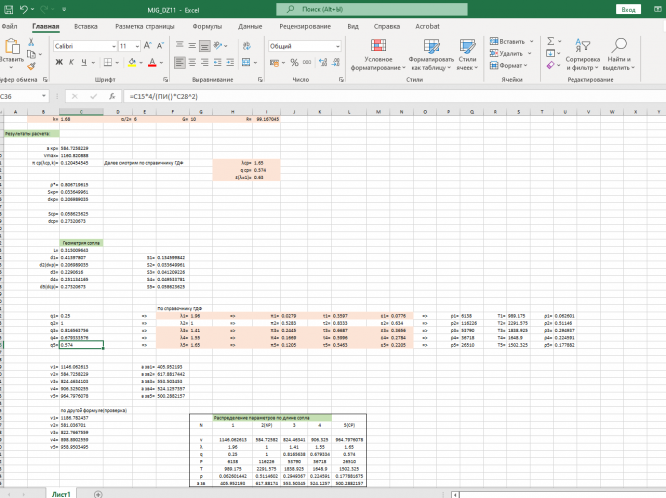 Условие: спроектировать с помощью ГДФ сопло Лаваля на заданные параметры. Необходимо определить , и получить в 5 сечениях значения . Затем, рассчитать полученное сопло при 2 нерасчетных режимах течения (для высот выше и ниже расчетной на плюс и минус 4 км). Графики выполнять на миллиметровке.