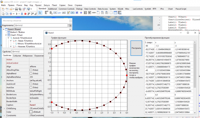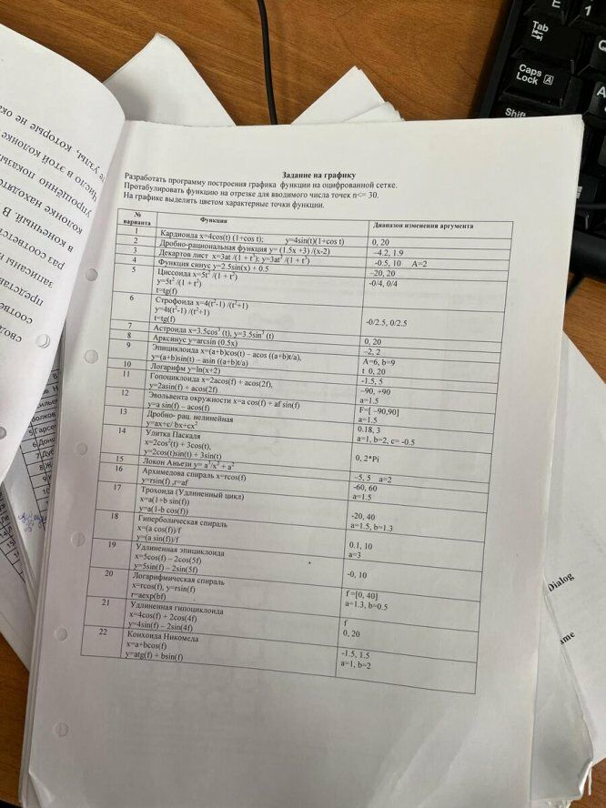 Лабораторная работа Задание на графику / задача из РК программа в Lazarus. В архиве также файл с объяснениями работы программы. Условие: Разработать программу построения графика функции на оцифрованной сетке. Протабулировать функцию на отрезке для вводимого числа точек n<=30. На графике выделить цветом характерные точки функции. Гопоциклоида описываемая уравнениями: x = 2*a*cos(f) + a*cos(2*f) , y = 2*a*sin(f) + a*cos(2*f) , при f = [-90, +90], a = 1.5 Вариант 11 Вот так выглядит форма в сделанном виде:.