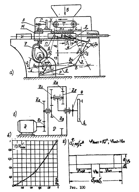 Ползун 5 приводится в движение рычажным механизмом, состоящим из кривошипа I, шатунов 2, 4 и коромысла 3, от электродвигателя Э (рис. 100б) через зубчатую передачу Z1, Z2 и планетарный редуктор Р с колесами Z3-Z6.