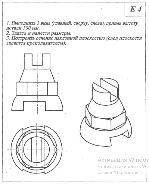 В архиве - 3D модель и чертёж детали Е из комплекта заданий по инженерной графике для 2 семестра. Размеры сняты с изображения, приведённого в условии задания. Чертёж из pdf-файла можно сразу переносить на ватман.