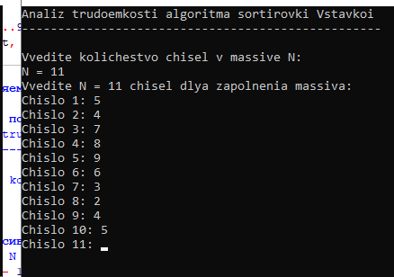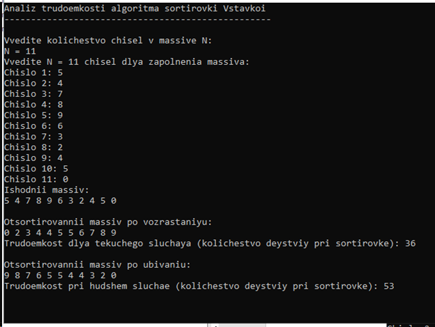 Для каждого элемента Numbers запоминается его значение в переменной temp. Затем запускается цикл while, который сравнивает temp с предыдущими элементами массива (Numbers[j]), сдвигая их вправо, пока не найдется место для вставки temp. При этом увеличивается счетчик Count, отвечающий за трудоемкость. Таким образом, каждая итерация цикла вставляет текущий элемент temp на правильное место в отсортированной части массива, формируя упорядоченную последовательность по возрастанию. Код программы: program project1; var Numbers: array[0..999] of Integer; i, j, temp, Count, CountMax, N: Integer; begin N := 0; // Обнуляем значение кол-ва чисел в массиве // Запрашиваем у пользователя количество чисел в массиве writeln(\'Analiz trudoemkosti algoritma sortirovki Vstavkoi\'); writeln(\'--------------------------------------------------\'); writeln; writeln(\'Vvedite kolichestvo chisel v massive N:\'); write(\'N = \'); readln(N); // Заполняем массив числами, введенными пользователем writeln(\'Vvedite N = \', N, \' chisel dlya zapolnenia massiva:\'); for i := 0 to N - 1 do begin write(\'Chislo \', i + 1, \': \'); readln(Numbers); end; // Выводим исходный массив на экран writeln(\'Ishodnii massiv:\'); for i := 0 to N - 1 do write(Numbers, \' \'); Count := 0; // Обнуляем счетчик действий (Трудоемкость) // Реализуем алгоритм сортировки вставкой (по возрастанию) for i := 1 to N - 1 do begin temp := Numbers; j := i - 1; while (j >= 0) and (Numbers[j] > temp) do begin Numbers[j + 1] := Numbers[j]; Inc(Count); // Увеличиваем счетчик на 1 Dec(j); end; Numbers[j + 1] := temp; end; // Выводим отсортированный массив и трудоемкость для текущего случая writeln; // Пустая строка writeln; // Пустая строка writeln(\'Otsortirovannii massiv po vozrastaniyu:\'); for i := 0 to N - 1 do write(Numbers, \' \'); writeln; writeln(\'Trudoemkost dlya tekuchego sluchaya (kolichestvo deystviy pri sortirovke): \', Count); // Вычисляем трудоемкость для \"худшего\" случая (все числа в обратном порядке) CountMax := 0; // Обнуляем счетчик действий (Трудоемкость для \"худшего\" случая) // Реализуем алгоритм сортировки вставкой для \"худшего\" случая (по убыванию) for i := 1 to N - 1 do begin temp := Numbers; j := i - 1; while (j >= 0) and (Numbers[j] < temp) do begin Numbers[j + 1] := Numbers[j]; Inc(CountMax); // Увеличиваем счетчик на 1 Dec(j); end; Numbers[j + 1] := temp; end; // Выводим отсортированный массив и трудоемкость для \"худшего\" случая writeln; // Пустая строка writeln(\'Otsortirovannii massiv po ubivaniu:\'); for i := 0 to N - 1 do write(Numbers, \' \'); writeln; writeln(\'Trudoemkost pri hudshem sluchae (kolichestvo deystviy pri sortirovke): \', CountMax); readln; end..