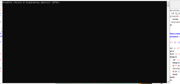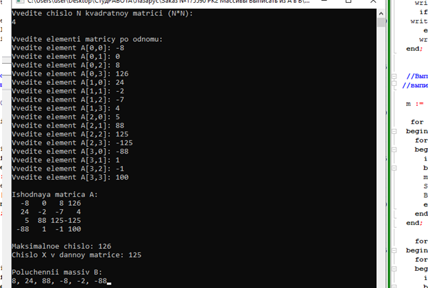 8.Выводит полученный массив B. 9.Завершает выполнение программы после ввода двух readln() для задержки консоли. Код: program project1; var n, m, i, j, X_index, maxChisloIndex: integer; maxChislo, minX, X, X_i, X_j: integer; A: array of array of integer; B: array of integer; begin writeln(\'Vvedite chislo N kvadratnoy matrici (N*N): \'); readln(n); writeln; SetLength(A, n, n); //Ввод элементов матрицы writeln(\'Vvedite elementi matricy po odnomu:\'); for i := 0 to n - 1 do begin for j := 0 to n - 1 do begin write(\'Vvedite element A[\', i, \',\', j, \']: \'); readln(A[i, j]); end; end; writeln; // Вывод матрицы для проверки writeln(\'Ishodnaya matrica A:\'); for i := 0 to n - 1 do begin for j := 0 to n - 1 do begin write(A[i, j]:4); end; writeln; end; maxChislo := -999999999; //присваиваем наименьшее, т.к.