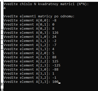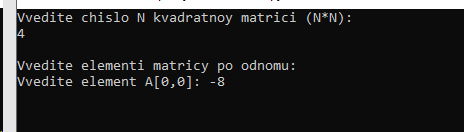 Выписать из квадратной матрицы в один новый массив 2.1, затем 2.2. 2.1 Все числа, стоящие раньше X, по порядку чтения и подходящие под условие Z. 2.2 Все числа Y, находящихся в зоне по углам и на главной диагонали. X – Ближайшее по модулю к максимальному числу (последнее, если несколько). Y – Отрицательное. Z – Больше нуля и кратно 8. Пример: Ввод: -808126 24-2-74 588125-125 -881-1100 Вывод (Х не выписывается): 8, 24, 88, -8, -2, -88 Программа в сделанном виде: 1.Запрашивает у пользователя ввод числа N, которое определяет размерность квадратной матрицы N*N. 2.Позволяет пользователю ввести элементы матрицы A по одному элементу в каждый цикл.