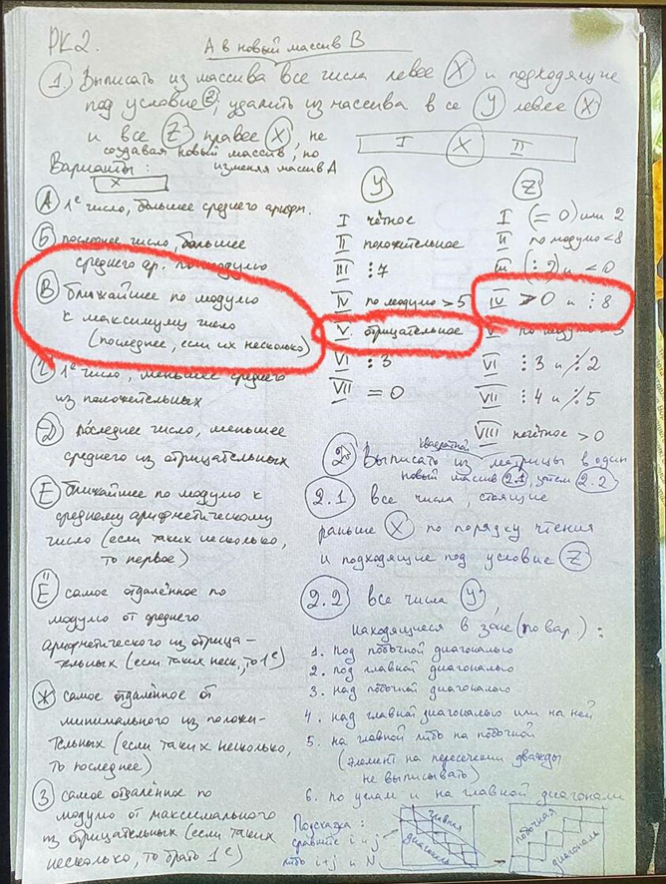 ищем наибольшее minX := 999999999; //присваиваем наибольшее, т.к. ищем наименьшее X_index:= 0; //порядкомый номер максимального элемента // Ищем максимальное число в матрице и его индекс for i := 0 to n - 1 do begin for j := 0 to n - 1 do begin if A[i, j] >= maxChislo then //если максимальное число в массиве повторяется, то берется последнее т.к. знак = begin maxChislo := A[i, j]; maxChisloIndex := i * n + j; //присваиваем порядковый номер в матрице end; end; end; // Ищем число самое ближайшее по модулю от максимального числа (Ищем Х) , если таких несколько берем последнее (знак <= в условии) for i := 0 to n - 1 do begin for j := 0 to n - 1 do begin if ((Abs(maxChislo - A[i, j]) <= minX) and (A[i, j] <> maxChislo)) then //ищем наименьшую разницу между числами и чтобы они не были равны (неполучился 0) begin X := A[i, j]; minX := Abs(maxChislo - A[i, j]); X_index := i * n + j; //присваиваем порядковый номер в матрице X_i := i; //присваиваем индексы Х X_j := j; end; end; end; writeln; //Выводим if maxChislo <> -999999999 then begin writeln(\'Maksimalnoe chislo: \', maxChislo) ; if X_index >= 0 then writeln(\'Chislo X v dannoy matrice: \', A[X_i, X_j]) else writeln(\'Chislo X ne naideno, v dannoy matrice vse chisla ravni !\'); end; //Выполним условия задачи: Выпишем в новый массив В все числа в порядке чтения слева от Х, подходящие под условие Z, //выпишем все числа Y, находящиеся по углам и на главной диагонали m := 0; //колличество элементов массива В for i := 0 to n - 1 do begin for j := 0 to n - 1 do begin if ((((i <= X_i) and (j < X_j)) or ((i < X_i) and (j <= X_j)) ) and (A[i, j] > 0) and (A[i, j] mod 8 = 0)) then //если индексы меньше индексов Х, делай (рассмотрим матрицу до Х) и условия подходят под Z begin m:= m + 1; SetLength(B, m); B[m-1] := A[i, j]; //присваиваем массиву В новый элемент из матрицы А end; end; end; for i := 0 to n - 1 do begin for j := 0 to n - 1 do begin if (((((i=(n-1)) and (j=0)) or ((i=0) and (j=(n-1)))) or (i = j)) and (A[i, j] < 0)) then //если (элемент находится в углу (2 угла - не учитывая на главной диагонали это (n-1),0 и 0,(n-1)) или на главной диагонали (индексы равны)) и условия подходят под Y begin m:= m + 1; SetLength(B, m); B[m-1] := A[i, j]; //присваиваем массиву В новый элемент из матрицы А end; end; end; writeln; // Выводим полученный массив B writeln(\'Poluchennii massiv B:\'); for i := 0 to High(B) do begin write(B); if i < m - 1 then write(\', \'); end; readln(); readln(); // два вызова readln() для задержки консоли end.