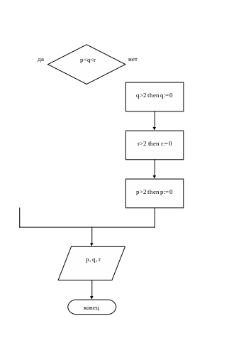 2. даны действительные числа p,q,r. Если p<q<r , то все числа заменить абсолютным значением минимального из них, если p>q>r, то те из них, которые больше 2, заменить нулями, в противном случае оставить числа без изменения.