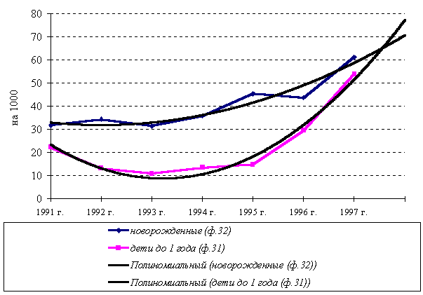 В сравнении со средними данными за 1993–1997 годы заболеваемость в 1998 году выросла почти на 30%. Наибольшее увеличение зарегистрировано по частоте возникновения заболеваний мочеполовой системы в 2.6 раза, врожденных аномалий в 2.2 раза, состояний, возникающих в перинатальном периоде в 2 раза, анемий на 40%. В 1997 году на первом месте в структуре заболевания органов дыхания – 31.9% (в 1996 году – 36.7%, в 1995 году – 42.1%). На втором месте состояния, возникающие в перинатальном периоде – 27.5% (в 1996 году – 24.4%, в 1995 году – 19.0%). На третьем месте заболевания нервной системы и органов чувств – 14.9% (в 1996 году – 14.5%, в 1995 году – 13.0%). На четвертом месте болезни крови и кроветворных органов – 5.5.% (в 1996 году – 5.9 %, в 1995 году – 5.3%). Уменьшился удельный вес инфекционных заболеваний с 6.8% в 1995 году до 2.4% в 1997 году. В целом интегральный показатель заболеваемости детей в возрасте до 1 года ухудшился с 1991 года в 2.5 раза.